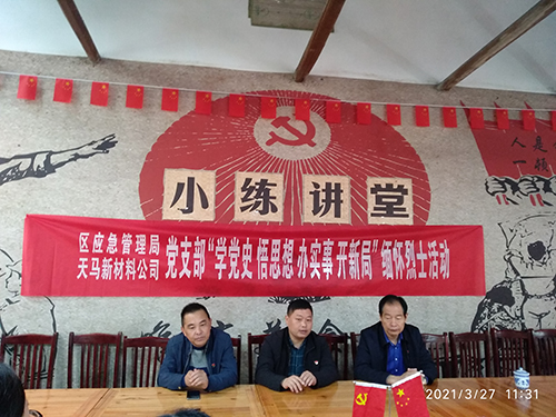 3月27日上午,區(qū)應急管理局黨支部、黃山天馬新材料科技有限公司黨支部聯合開展了“學黨史 悟思想 辦實事 開新局”緬懷革命烈士清明節(jié)掃墓主題黨日活動。 二個黨支部全體黨員在書記吳局和馬總的帶
